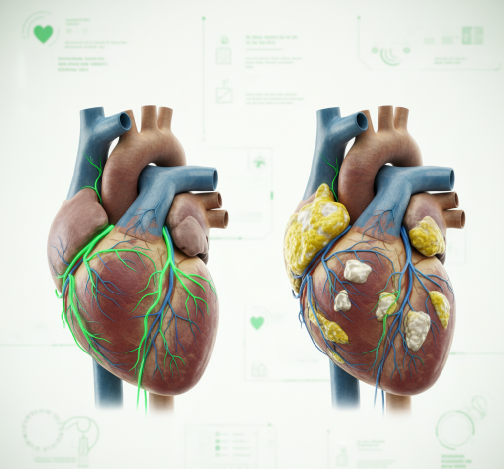 이 질환의 핵심은 동맥경화증(Atherosclerosis)이에요. 혈관 벽에 지방, 콜레스테롤, 칼슘 등이 쌓여 죽상판(Plaque)이라는 덩어리가 만들어지고, 이 덩어리가 혈관을 좁아지게 만들거나(협착) 막아버리는 거죠. 혈관이 좁아지면 혈액 공급이 부족해져 가슴 통증(협심증)이 발생하고, 완전히 막히면 심장 근육이 죽는 심근경색(Myocardial Infarction)으로 이어지게 됩니다. 생각만 해도 아찔하죠? 😥