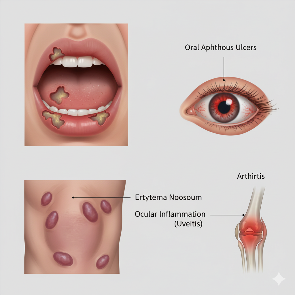 - 전신 염증: 구강, 성기, 피부, 눈, 관절 등 여러 부위 침범