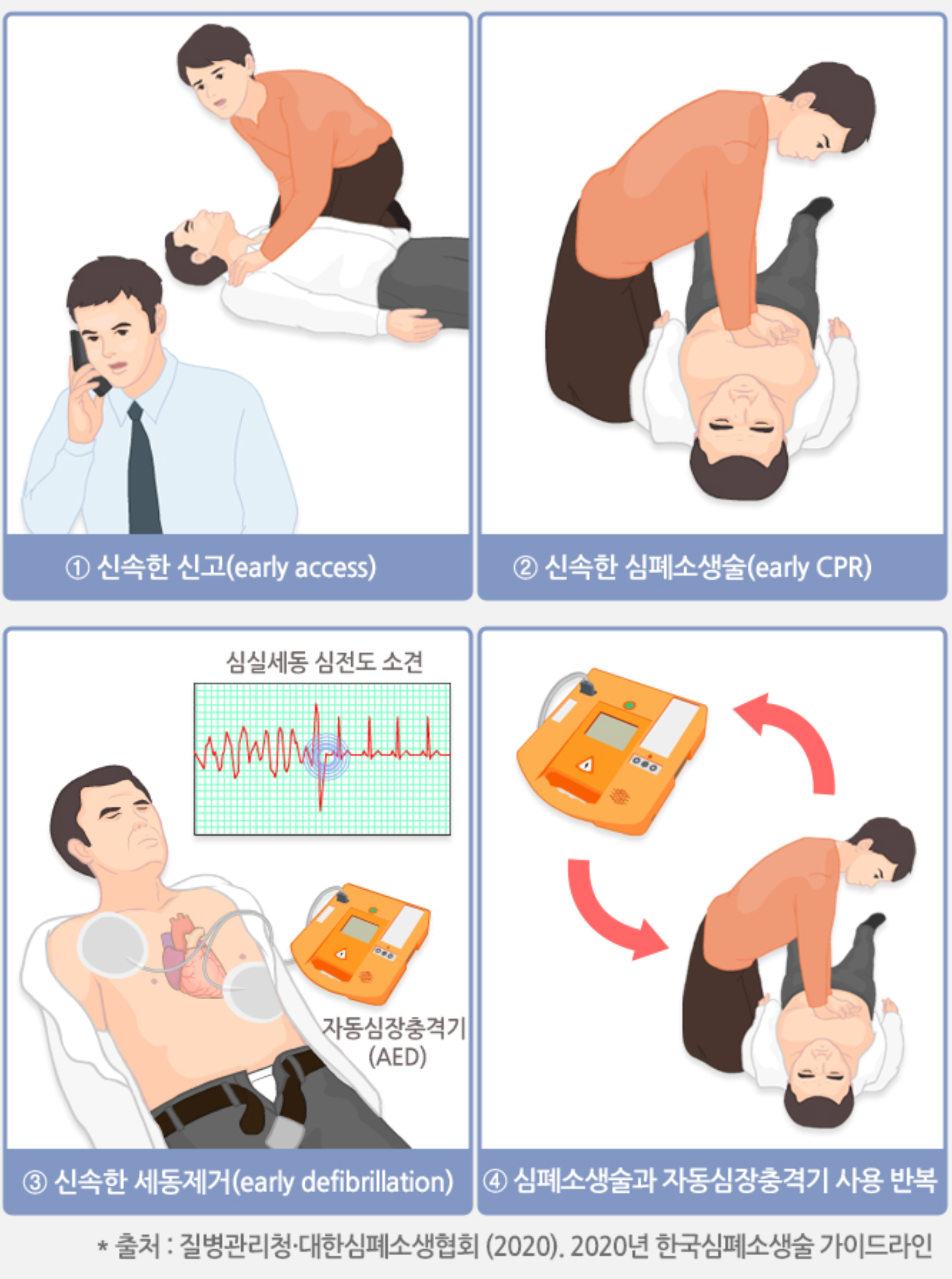 4. 생존 사슬 Chain of Survival : 심폐 소생술은 응급 의료 서비스의 조기 인식 및 활성화, 신속한 제세동, 효과적인 심폐 소생술 및 고급 생명 지원을 포함하는 응급 의료에서 광범위한 생존 사슬의 일부입니다.
